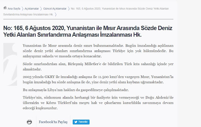 «Δεν υπάρχει θαλάσσιο σύνορο ανάμεσα στην Ελλάδα και την Αίγυπτο. Για την Τουρκία είναι ανύπαρκτη η δήθεν συμφωνία καθορισμού συνόρων που ανακοινώθηκε πως υπεγράφη σήμερα».