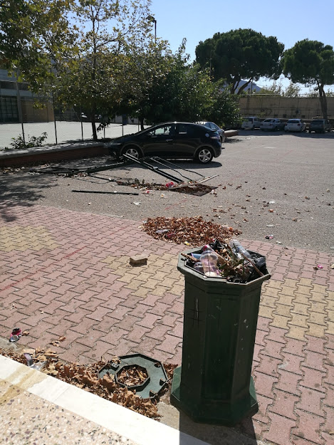 2) Ο προαύλιος χώρος είναι γεμάτος σκουπίδια, ξερά φύλλα, χόρτα που έχουν φυτρώσει παντού, με αποτέλεσμα να ερχόμαστε συχνά αντιμέτωποι, τόσο εμείς, όσο και οι μαθητές μας με φίδια! Επίσης, σπασμένες αθλητικές εγκαταστάσεις, κατεστραμμένες και πεσμένες στο έδαφος μπασκέτες, κάδοι σκουπιδιών που ξεχειλίζουν, σχεδόν όλες οι βρύσες σπασμένες και εκτός λειτουργίας.