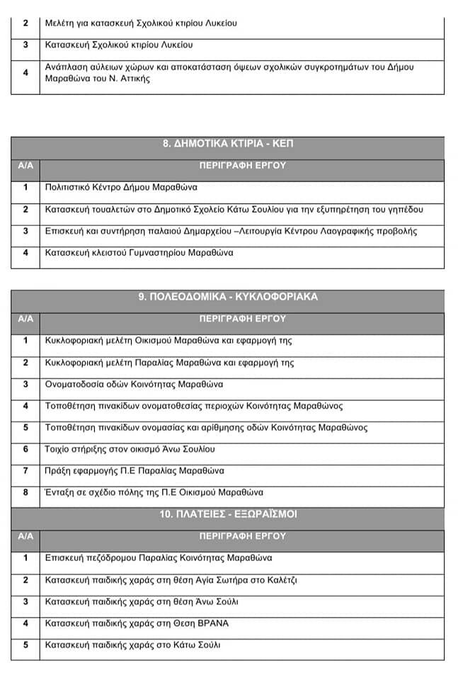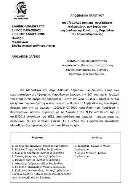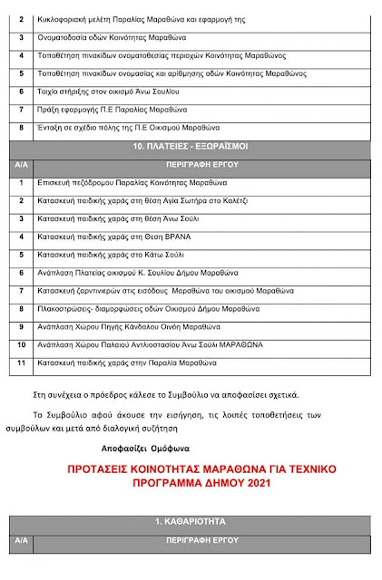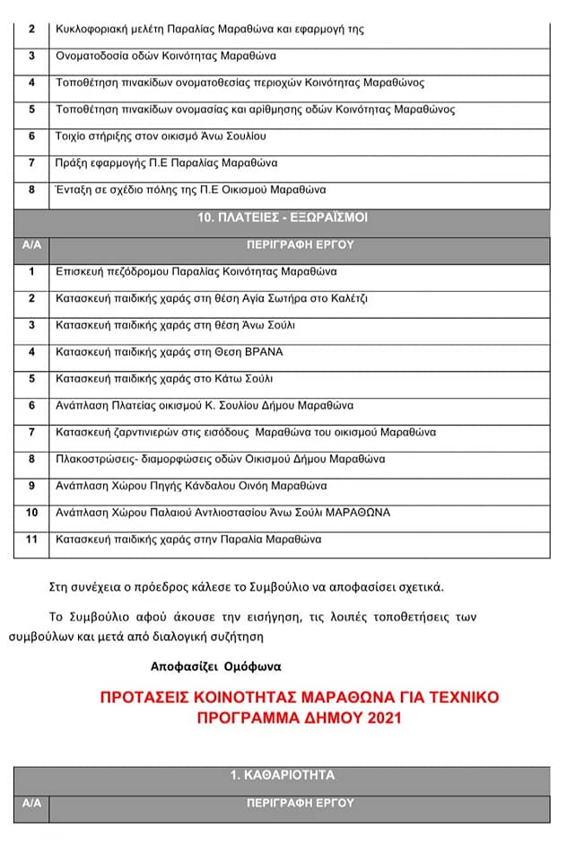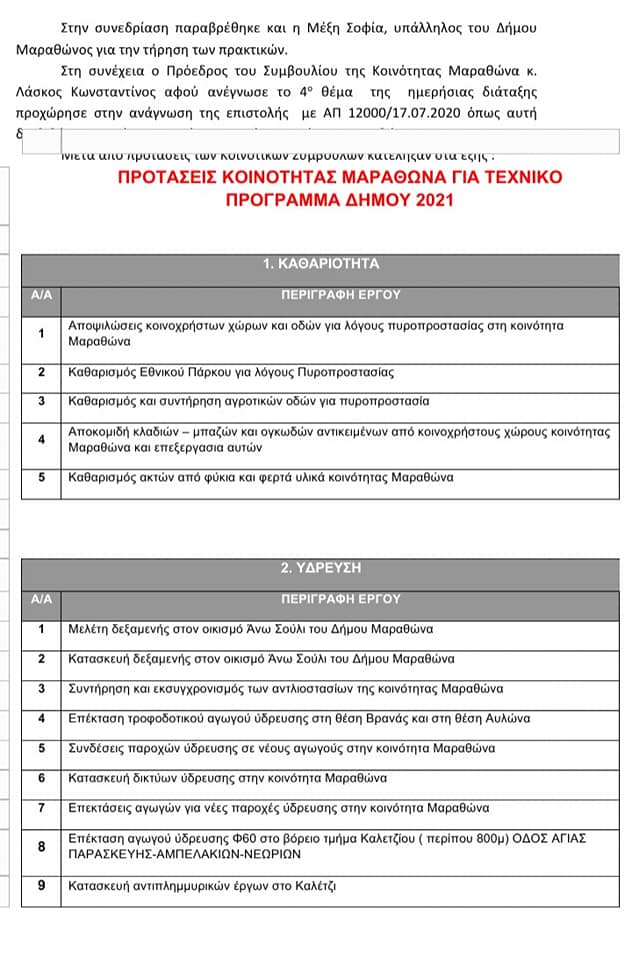 Κατόπιν τακτικής συνεδρίασης που είχε πραγματοποιηθεί "Περί συμμετοχής του Κοινοτικού Συμβουλίου στην κατάρτιση του Επιχειρησιακού και Τεχνικού Προγράμματος του Δήμου" στον Μαραθώνα την 30/7/2020 αποφασίστηκαν ομόφωνα οι προτάσεις της κοινότητας για το τεχνικό πρόγραμμα του Δήμου 2021.