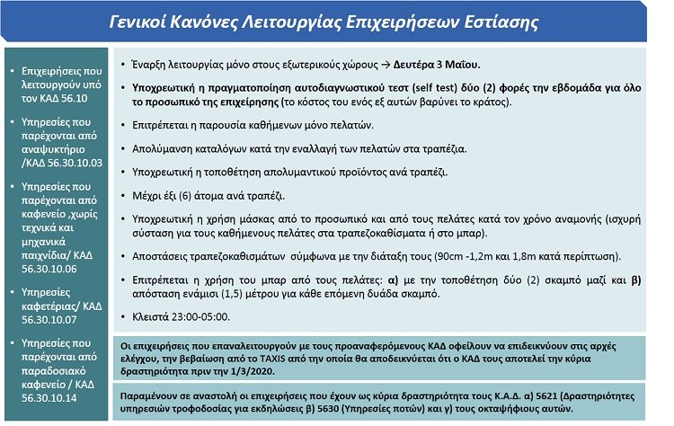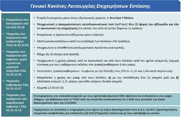 Οι αποστάσεις των τραπεζοκαθισμάτων σύμφωνα με τη διάταξη (90 cm - 1,2 m- 1,8m), επιτρέπεται η χρήση του μπαρ από τους πελάτες με τη χρήση δυο σκαμπό μαζί. Η επόμενη δυάδα θα βρίσκεται σε απόσταση 1,5 μέτρου. Κλειστές θα παραμένουν οι επιχειρήσεις από 11 τη νύχτα μέχρι 5 το πρωί αλλά εξαιρούνται οι υπηρεσίες ντελίβερι με απαγόρευση πώλησης αλκοόλ. Οι επιχειρήσεις που θα λειτουργήσουν, όταν τους ζητηθεί στον έλεγχο θα πρέπει να φαίνεται από το TAXIS, ότι ο ΚΑΔ αποτελεί κυρία δραστηριότητα πριν την 1η Μαρτίου 2020.