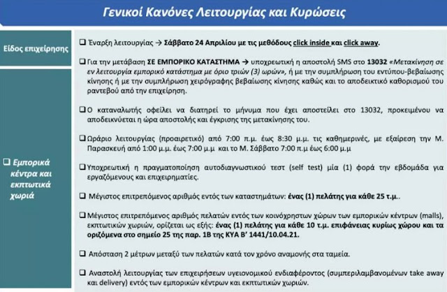 Από Σάββατο 24 Απριλίου, θα λειτουργήσουν με τη διαδικασία καθορισμού ραντεβού για αγορά εντός καταστήματος (click inside) οι εμπορικές επιχειρήσεις στις Περιφερειακές Ενότητες Θεσσαλονίκης και Κοζάνης, καθώς και τα εμπορικά κέντρα και εκπτωτικά χωριά, με την ίδια μέθοδο, σε όλη την επικράτεια.